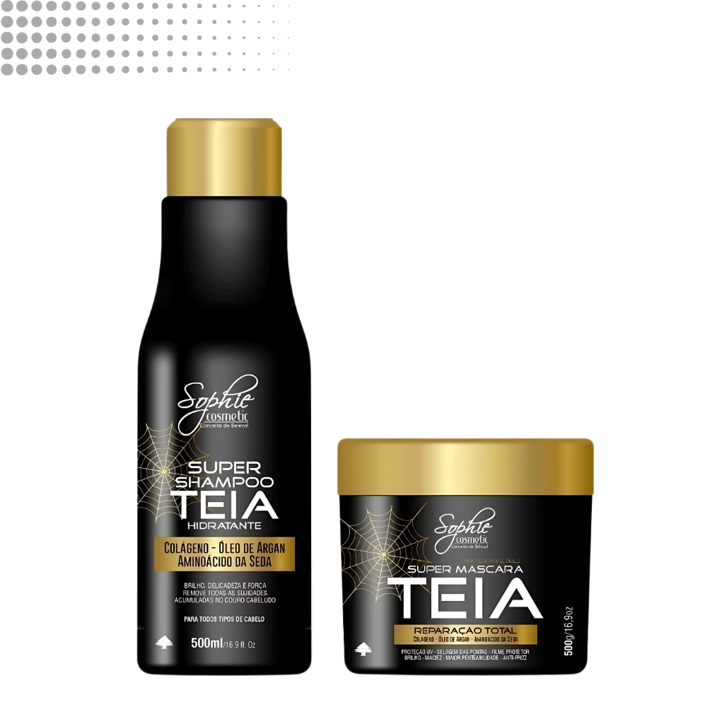 Sua formulação é semelhante a estrutura de fibra capilar natural por possuir proteínas e aminoácidos biocompativeis com o cabelo. Com ação direta sobre o córtex, age de dentro pra fora promovendo uma reconstrução imediata dos cabelos. Proteção UV, Selagem das Pontas, Filme Protetor, Brilho, Maciez, Maior Penteabilidade, Anti-frizz. COLÁGENO - ÓLEO DE ARGAN - AMINOÁCIDO DA SEDA. Seu pacote contém: 1 Shampoo Teia 500ml + Mascara Super Hidratante Teia 500g